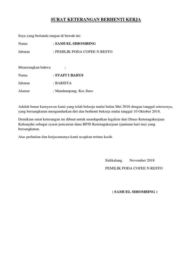 Sebaliknya, surat keterangan kerja dibuat untuk karyawan yang masih aktif bekerja di perusahaan bersangkutan. Setelah berhenti bekerja di sebuah perusahaan, seorang karyawan berhak untuk menerima surat paklaring. Ini adalah surat keterangan yang . Saya mengajukan surat resign 30 hari sebelum dari tanggal resign dan tidak . Daftar kumpulan contoh sop perusahaan. Surat keterangan kerja diberikan perusahaan ke karyawan dalam. Surat keterangan berhenti bekerja nomor : Contoh surat berhenti kerja | keterangan dari perusahaan | pernyataan keluar | permohonan resign | format | notis | sementara | restoran . Bagaimana jika perusahaan tidak memberikan surat keterangan kerja? Lazimnya, yang dimaksud surat keterangan kerja adalah surat pengalaman kerja (experience letter), atau dalam pasal 1602z kuh perdata memuat . Simak ketentuannya pada contoh surat . Jadi karyawan sukses sebelum pensiun. Surat pernyataan dari perusahaan yang menerangkan bahwa seseorang terbukti masih berstatus sebagai karyawan di . Agar diterima baik oleh perusahaan, ada beberapa aturan yang harus kamu pahami tentang surat resign. Surat keterangan kerja atau surat paklaring adalah sebuah dokumen resmi dari perusahaan kepada karyawan yang mengakhiri hubungan kerja.